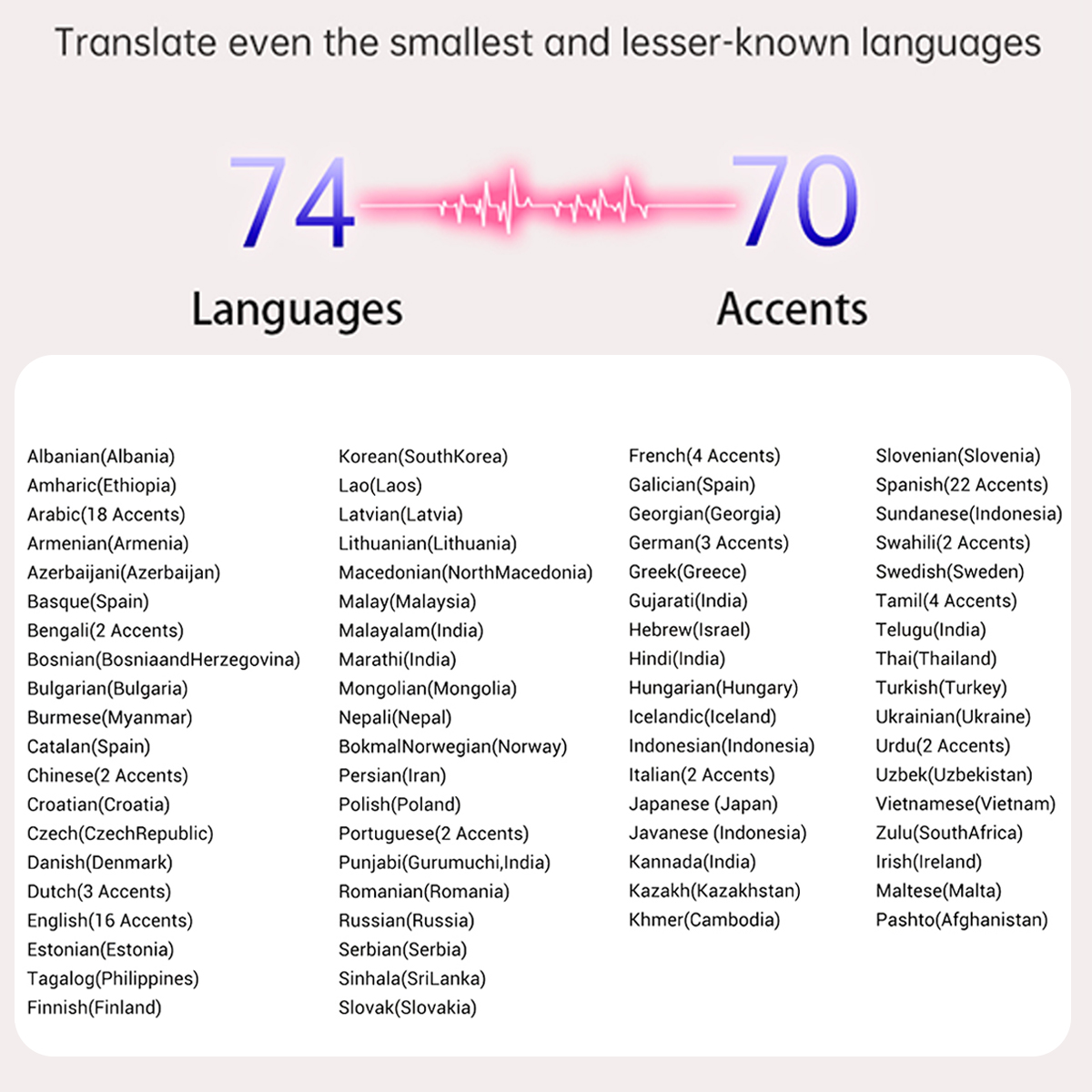 Even the smallest languages can be translated, language 74, accent 70;